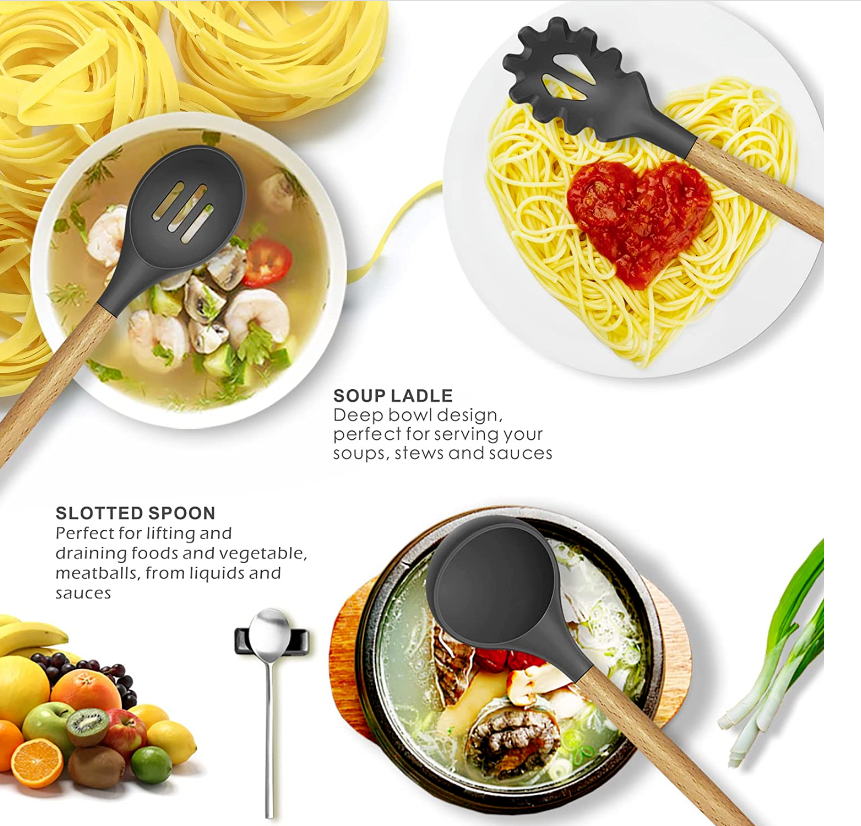 These 14 pieces of cooking utensil set meet basic cooking needs and are essential for the kitchen of a new home or apartment. Each has its own unique use. You can decorate your kitchen by hanging them in the corners of your kitchen through the holes at the top of the wooden handles to keep them organized