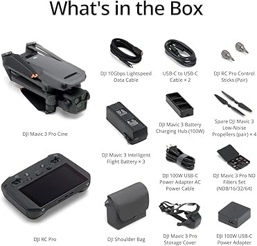 Included ComponentsDJI Shoulder Bag x1, DJI Mavic 3 Pro Cine x1, Spare DJI Mavic 3 Low-Noise Propellers (pair) x4, DJI Mavic 3 Intelligent Flight Battery x3, DJI RC Pro Control Sticks (Pair) x1, DJI 100W USB-C Power Adapter x1, DJI 10Gbps Lightspeed Data Cable x1, DJI 100W USB-C Power Adapter AC Power Cable x1, DJI Mavic 3 Battery Charging Hub (100W) x1, DJI RC Pro x1, DJI Mavic 3 Pro Storage Cover x1, USB-C to USB-C Cable x2, DJI Mavic 3 Pro ND Filters Set (ND8/16/32/64) x1 See more
