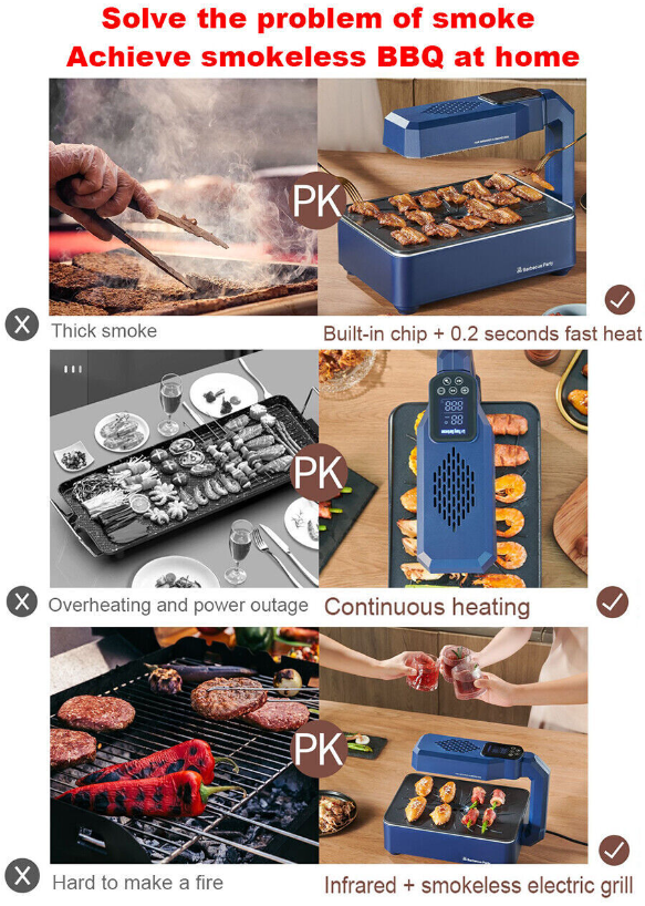 Feature: 1.Heat pipe heating Control the temperature of grease, reduce oil fume, heat light far infrared heating, and heat up faster. 2.Surround heating The chassis is heated around, and the upper and lower exhausts are evenly exhausted for heat dissipation, which has a long service life and a longer use time. 3.LCD liquid crystal screen Control the temperature by yourself, easily realize the freedom of barbecue, easy to operate, and control the deliciousness by yourself 4.Smokeless BBQ Don't worry about oil fumes, the best choice for family gatherings, colleagues' dinners, one person's food. Specification: Voltage: 110VRated power: 850W Touch screen mode: LCD touch screen Product color: Blue Product size: 37 x 22 x 27cm = 14.56 x 8.66 x 10.62 inch Package include: 1 x Electric Infrared Grill Note: Due to the different monitor and light effect, the actual color of the item might be slightly different from the color showed on the pictures. Thank you! Please allow 1-2cm measuring deviation due to manual measurement. |
