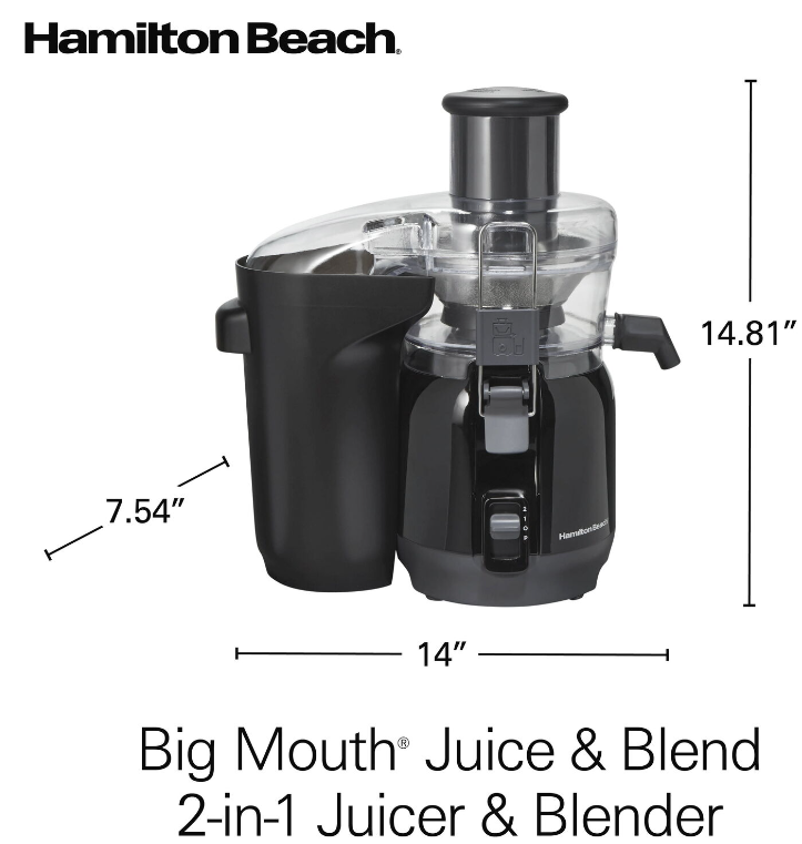 Juicing and blending go hand-in-hand as part of a healthy lifestyle, and now you can juice and blend with one space-saving appliance. Thanks to its versatile 2-in-1 design, the Hamilton Beach Big Mouth® Juice & Blend 2-in-1 Juicer and Blender makes fresh juice from whole fruits and vegetables, which you can add to all your favorite blended recipes. You’ll save time as you juice because the 3" Big Mouth® chute fits whole produce, and by replacing the juice extractor attachment with the 20 oz. blender jar, you can juice directly into it — no need to transfer juice from one container to another. With this versatile 2-in-1 appliance, you can go from making simple juice to creating a wide variety of flavorful smoothies, shakes, cocktails or slushies. You'll easily power through tough ingredients like hard produce and ice with its 800 watt, 2 speed motor and pulse. Amp up your nutrition and add more flavor to your life today — recipes are included to get you started. Includes patented Easy Sweep™ cleaning tool and removable, dishwasher safe parts for easy cleanup. Backed by Hamilton Beach, the #1 brand in juice extractors