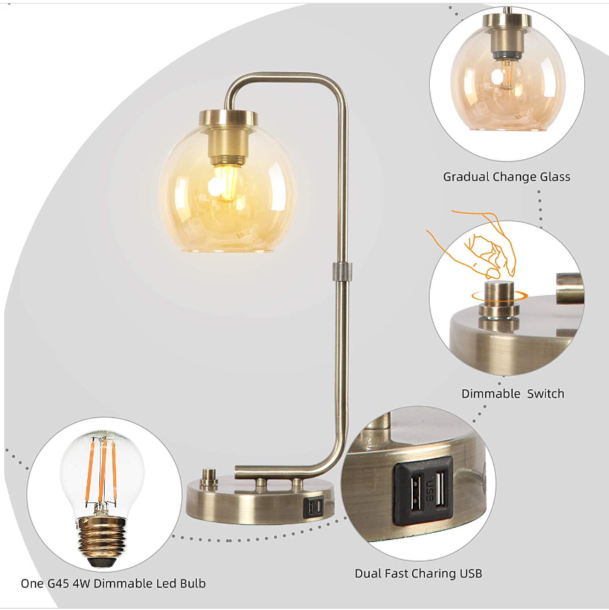 Jiosxc Industrial Table Lamp with 2 USB Ports, stepless dimmable Lamp, Dimmable Bedside Reading Lamp, Brass Metal Desk Lamp with E26 Edison LED Bulb Glass Shade for Bedroom Living Room Office